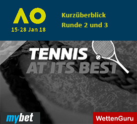 Die Australien Open 2018 gehen in die 3. Runde. Mybet bietet euch hierfür ein super Angebot speziell für dieses Event. Und es ist noch nicht zu spät hier mitzumachen. Alle Einzel- und Kombiwetten, die ihr vor den Spielen oder live mit einer Mindestquote von 2.0 absetzt, zählen zu eurem Gesamtumsatz dazu. Erreicht ihr mit allen Wetten auf die Australien Open 2018 einen Gesamteinsatz von 1000€, dann erhaltet ihr sofort einen Cash-Bonus von 100€. Hierfür müsst ihr euch einfach unter eurem Konto bei „Meine Boni“ für die Aktion anmelden. Besitzt ihr noch kein Konto, könnt ihr euch ganz einfach bei mybet registrieren und dann auch von der Aktion profitieren.